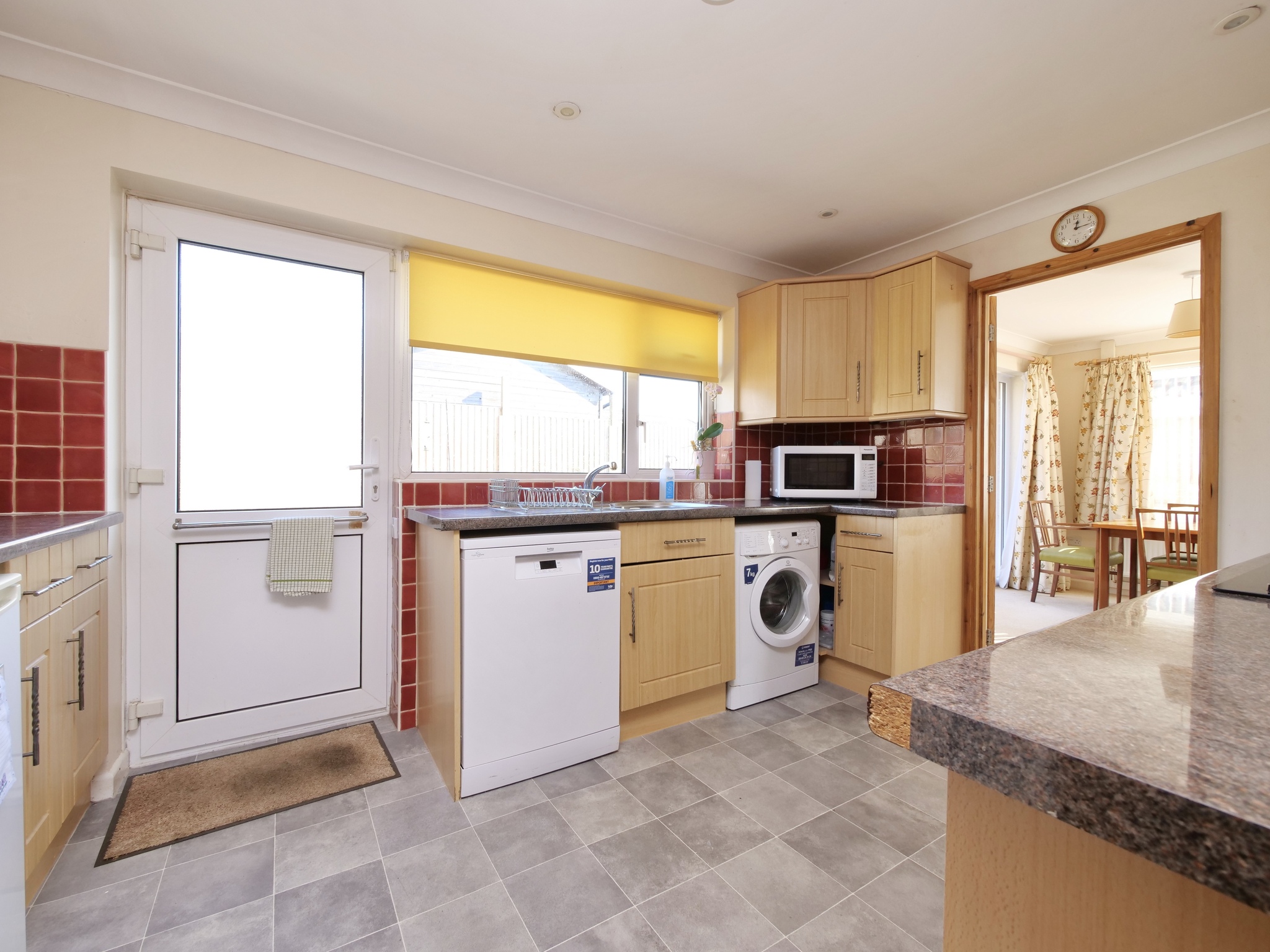 The dining room enjoys views over the rear garden and benefits from French doors opening onto the garden, creating an ideal space for entertaining or family dining. The adjoining kitchen is fitted with a range of wall and base units with ample work surfaces and space for appliances, with a window overlooking the rear garden and a door providing direct access outside.