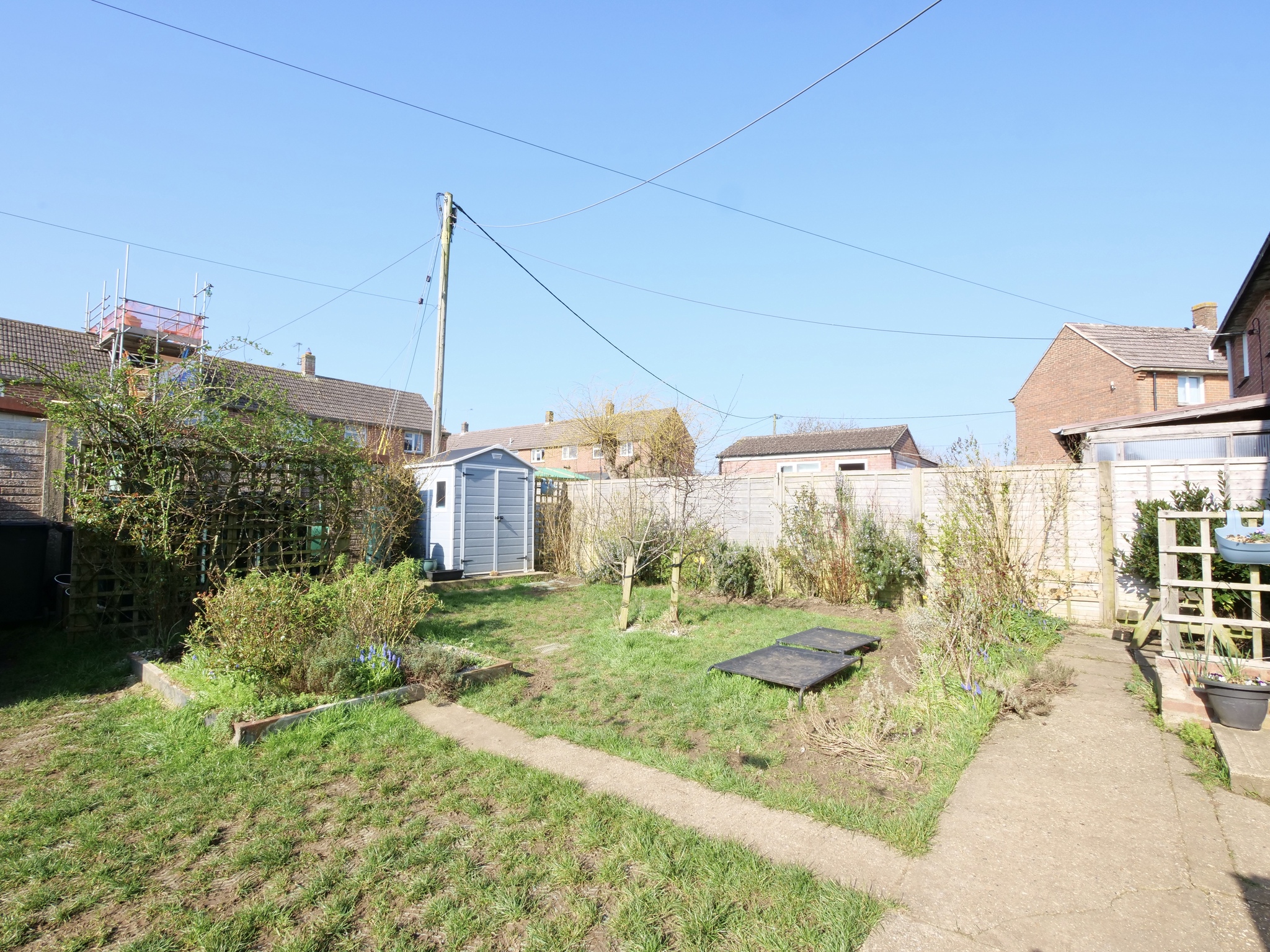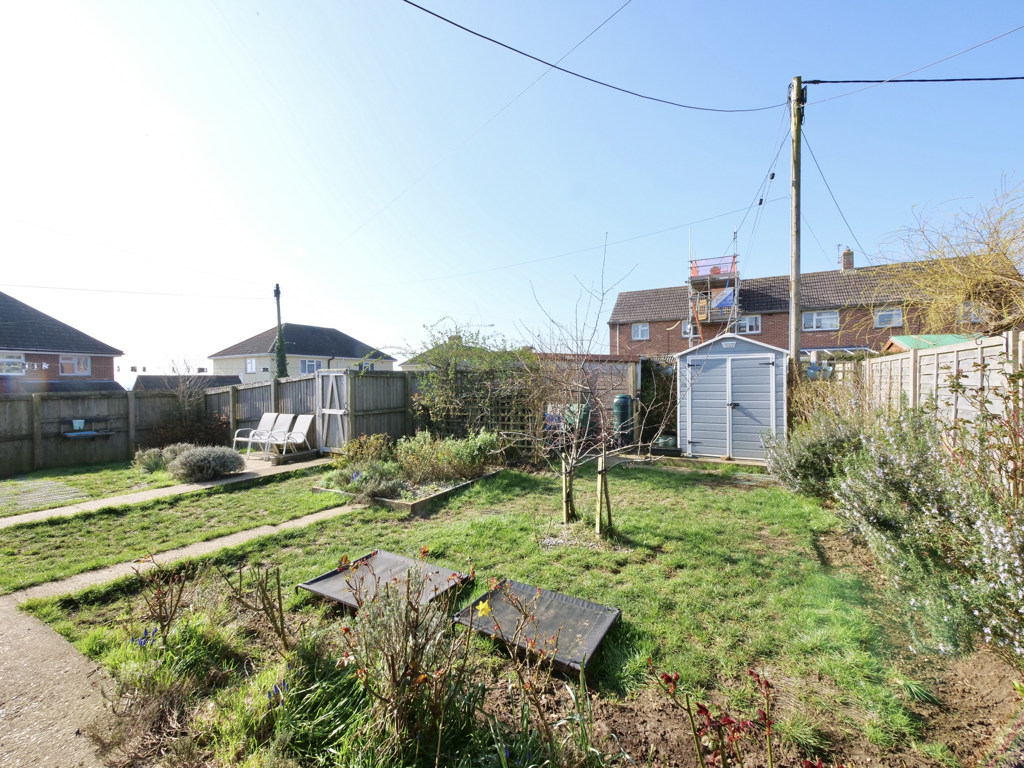Externally, the property benefits from a good-sized enclosed rear garden, mainly laid to lawn with planted borders, a garden shed, and space for seating areas, making it ideal for outdoor enjoyment and gardening enthusiasts.