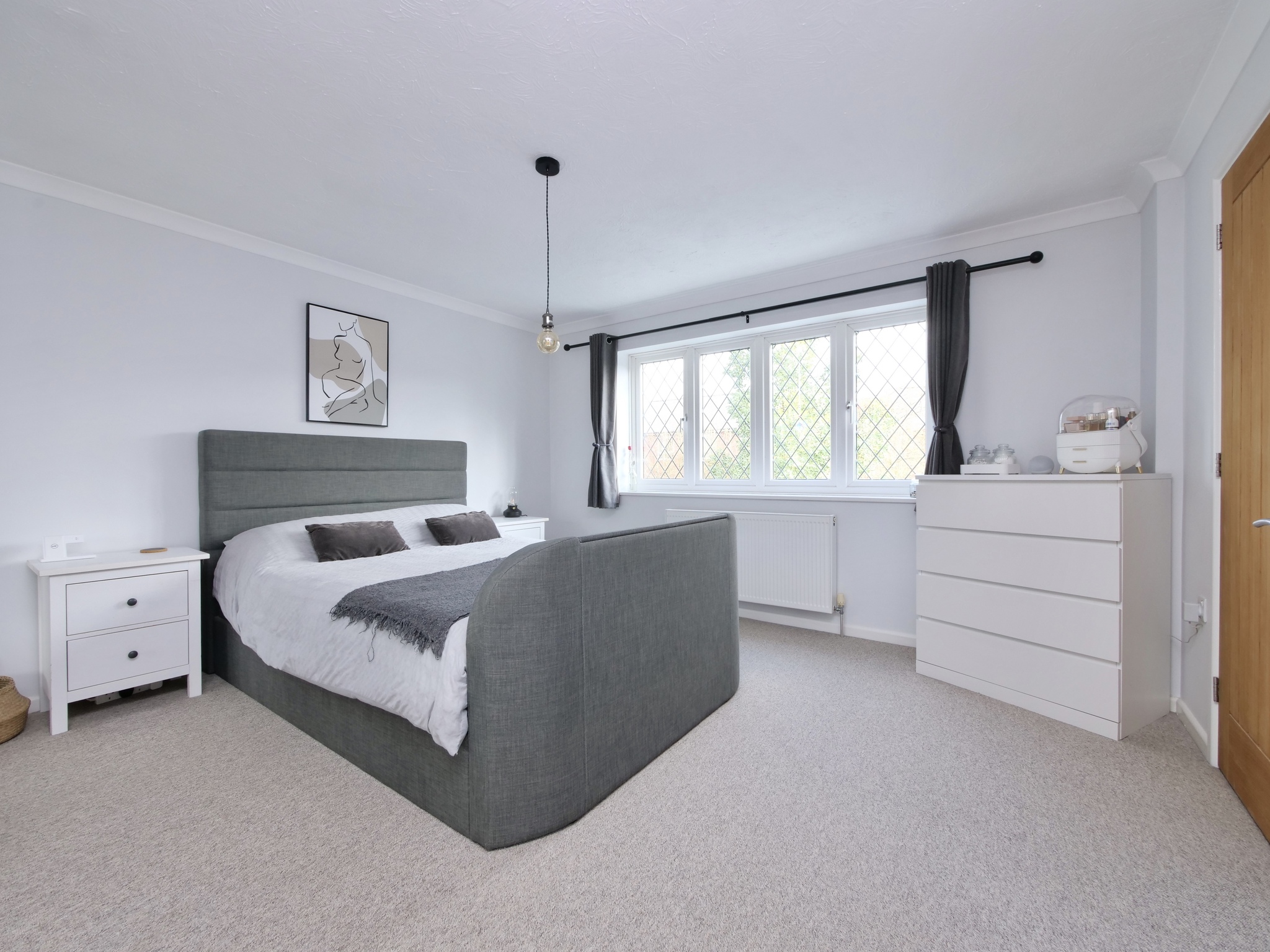 Upstairs, the first floor offers four well-proportioned bedrooms. The principal bedroom benefits from fitted wardrobes and a private en-suite bathroom. Three further bedrooms are served by a modern family bathroom, while additional built-in storage and an airing cupboard enhance functionality.