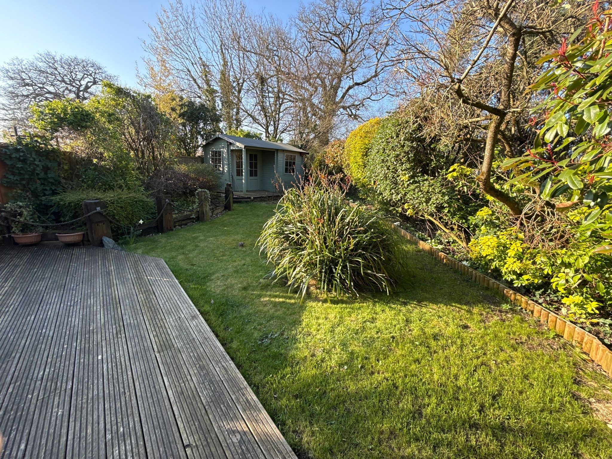 The garden has been thoughtfully arranged to create distinct areas for relaxation and entertaining. A generous patio sits directly off the main living space, providing the perfect spot for outdoor dining and summer gatherings. In addition, a separate decked area sits higher up offerin the perfect sun trap for al fresco dining or evening drinks. The remainder of the garden is laid to lawn, creating an attractive and usable space that is easy to maintain while still offering plenty of room to enjoy.