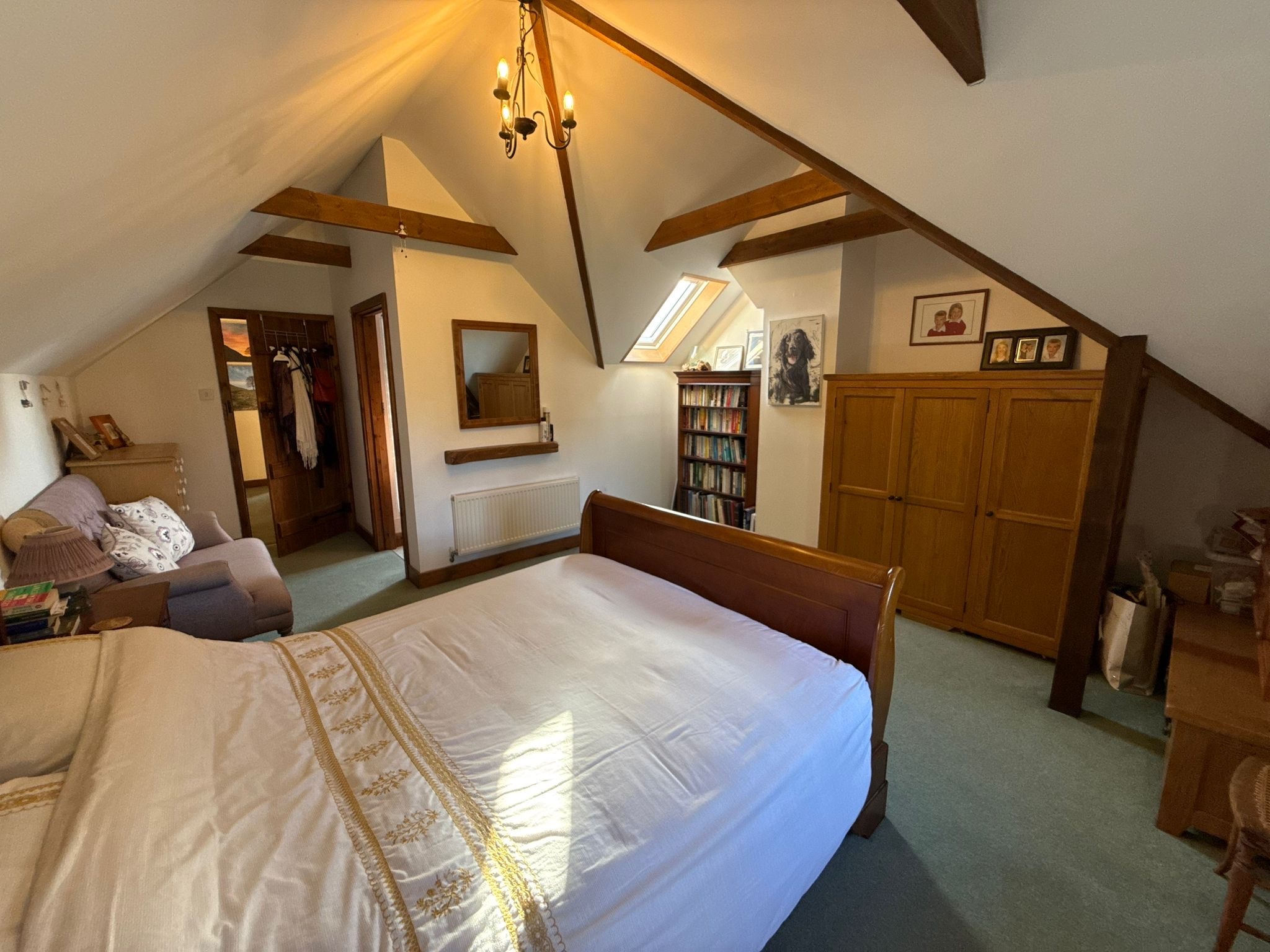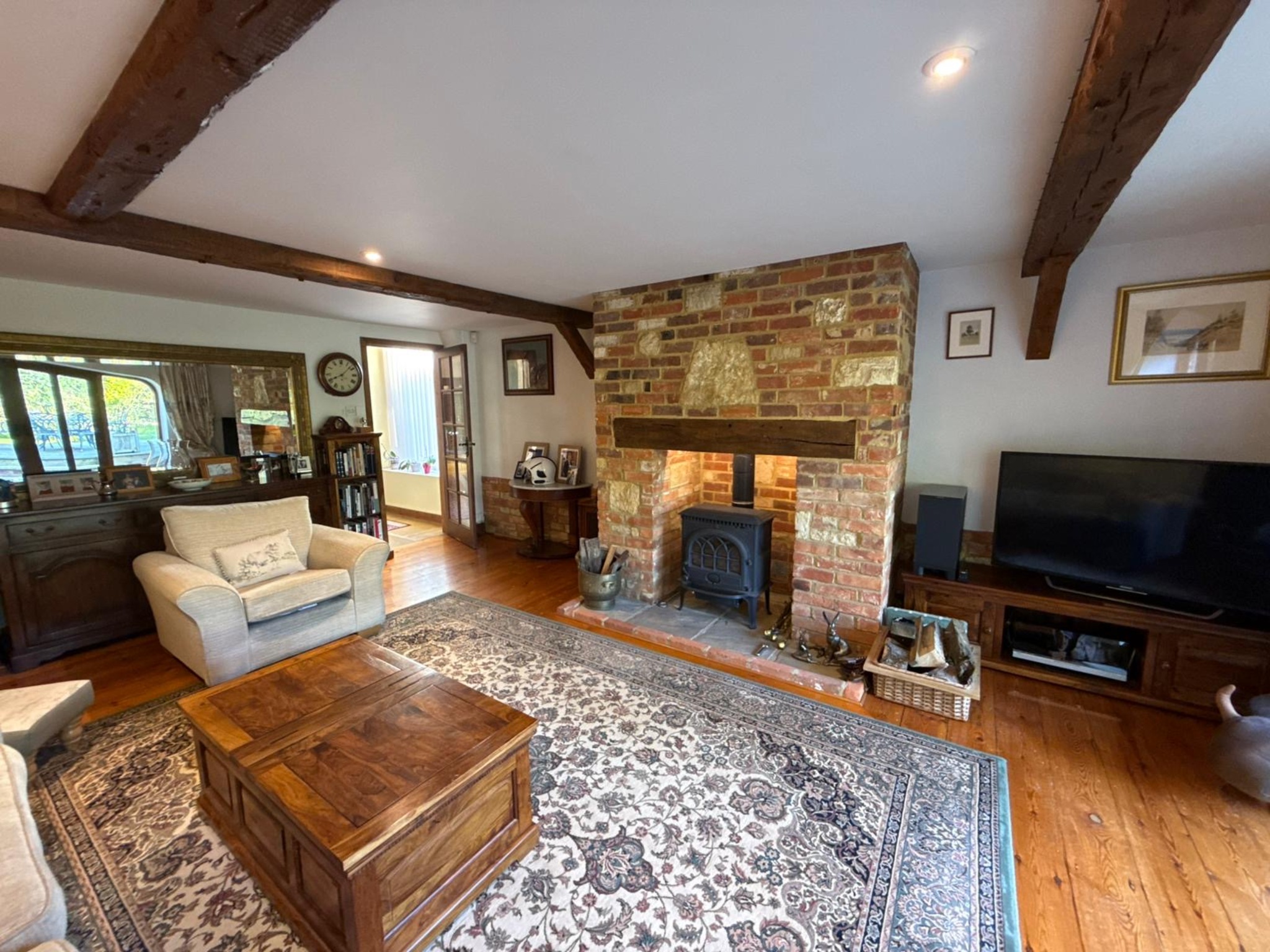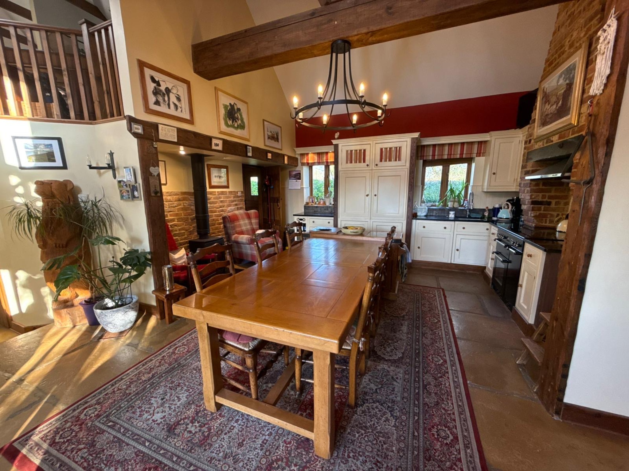 The heart of the home is the striking kitchen/dining room, where a vaulted ceiling and full-height arched glazing create a wonderfully light and welcoming space. The separate sitting room, complete with exposed beams and a wood-burning stove, offers a cosy yet spacious retreat. A downstairs WC completes the ground floor.