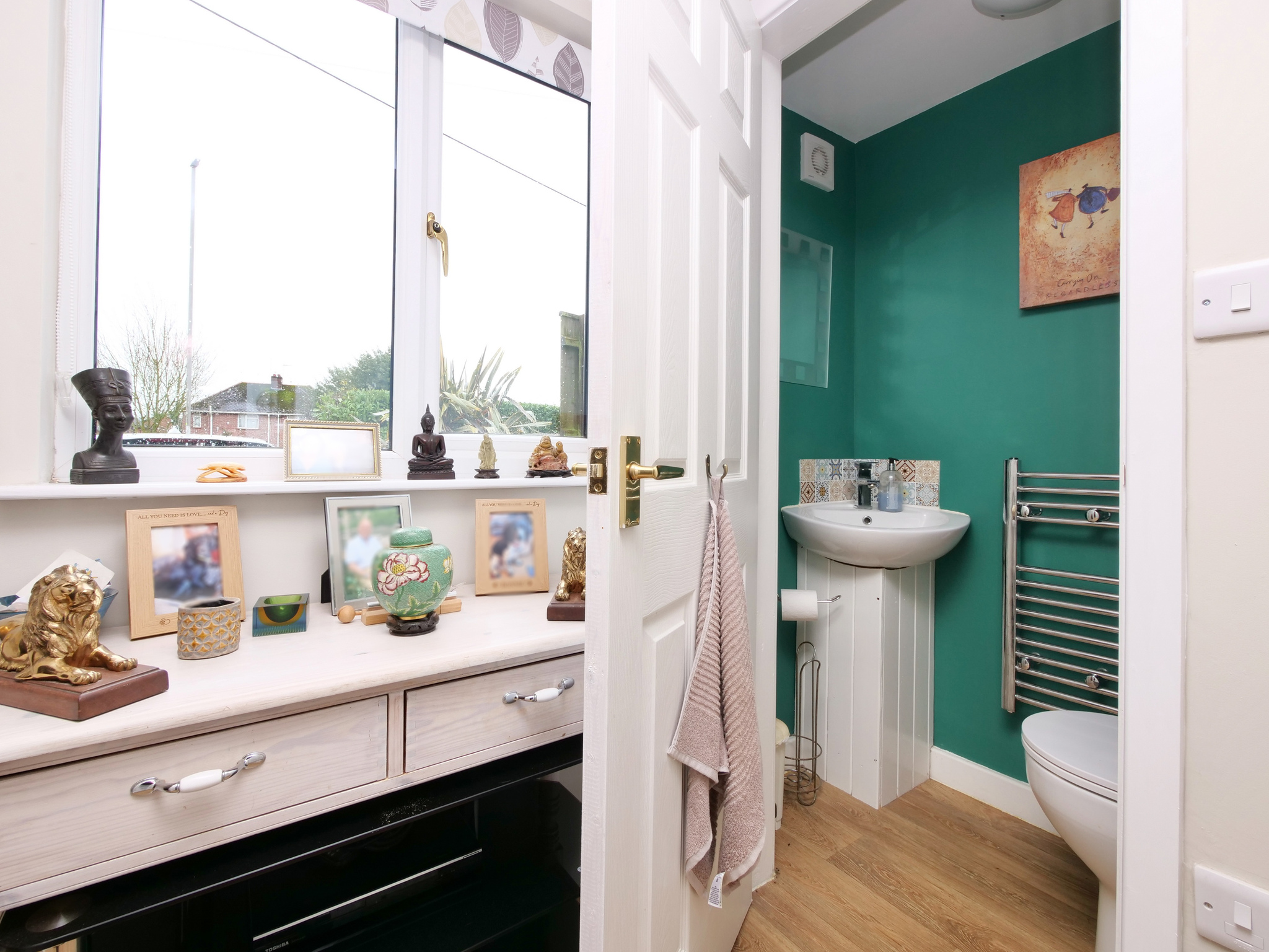 The property is approached via a driveway providing off-road parking, with an attractive front aspect. On the ground floor, the accommodation comprises a welcoming entrance hall with cloakroom/WC, a spacious sitting room enjoying a pleasant outlook, and a well-proportioned dining room. The fitted kitchen sits to the rear of the property, offering ample worktop and cupboard space and direct access to the garden, making it practical for everyday living.