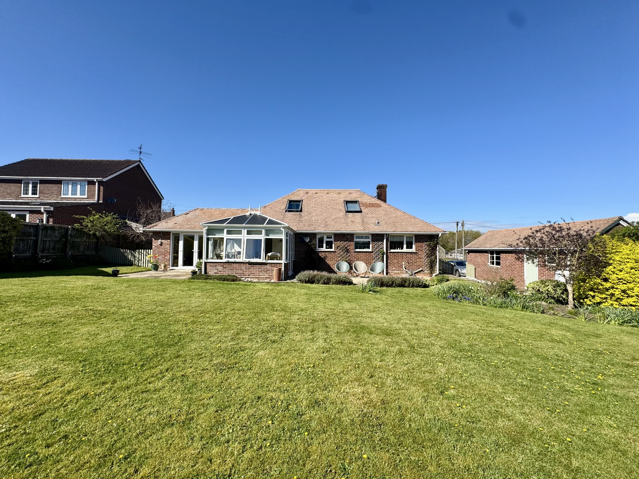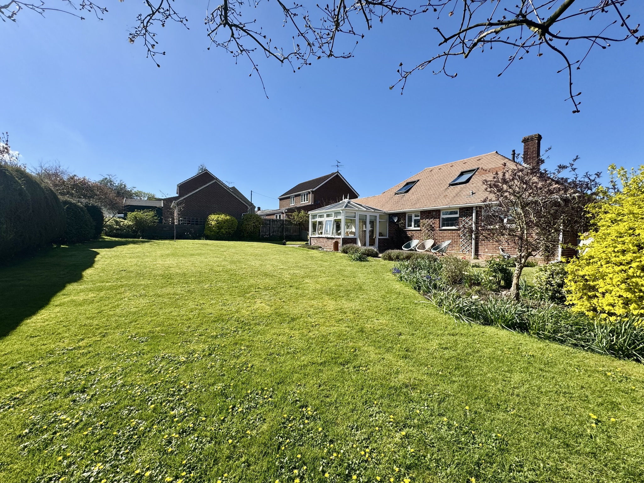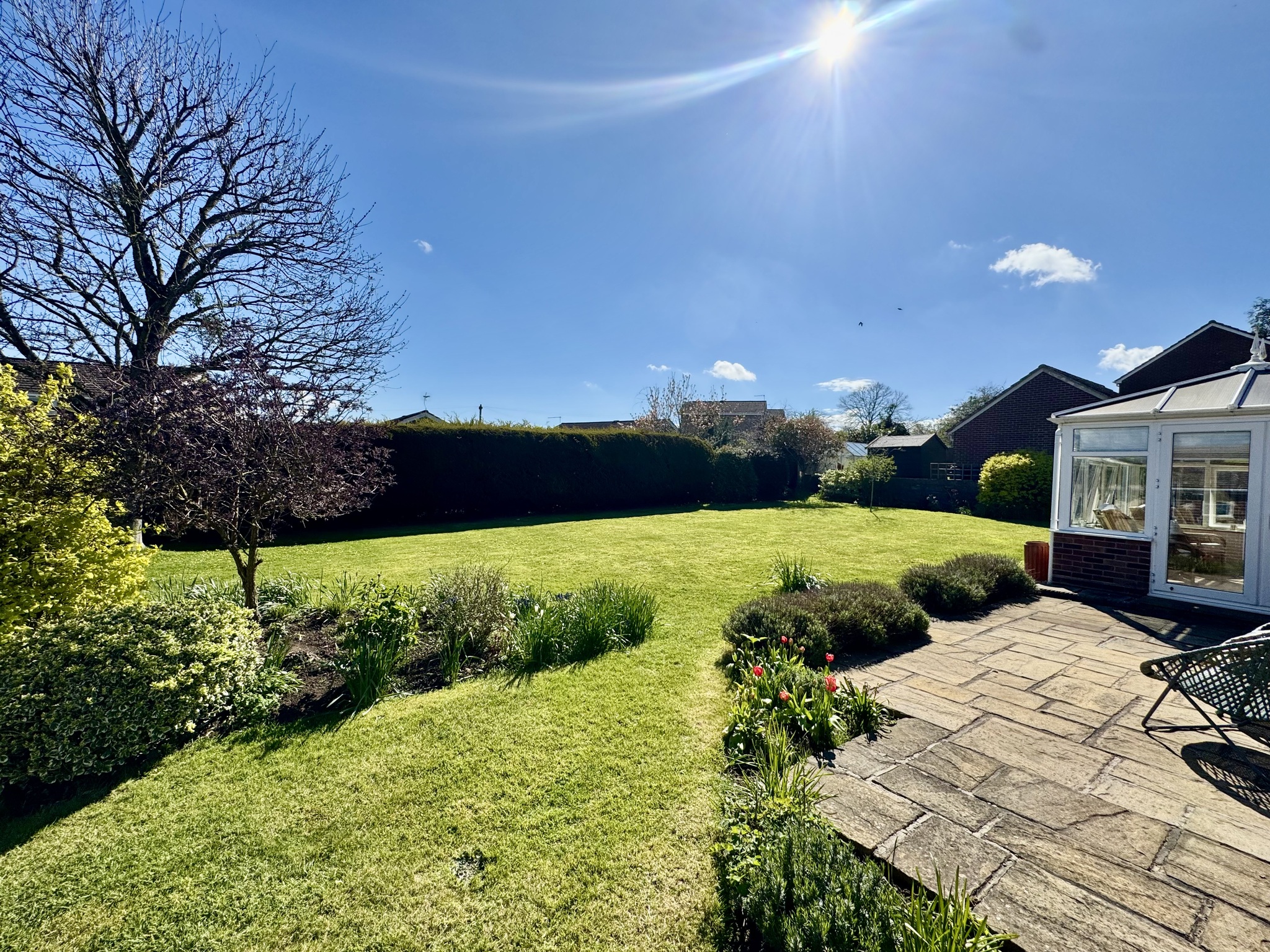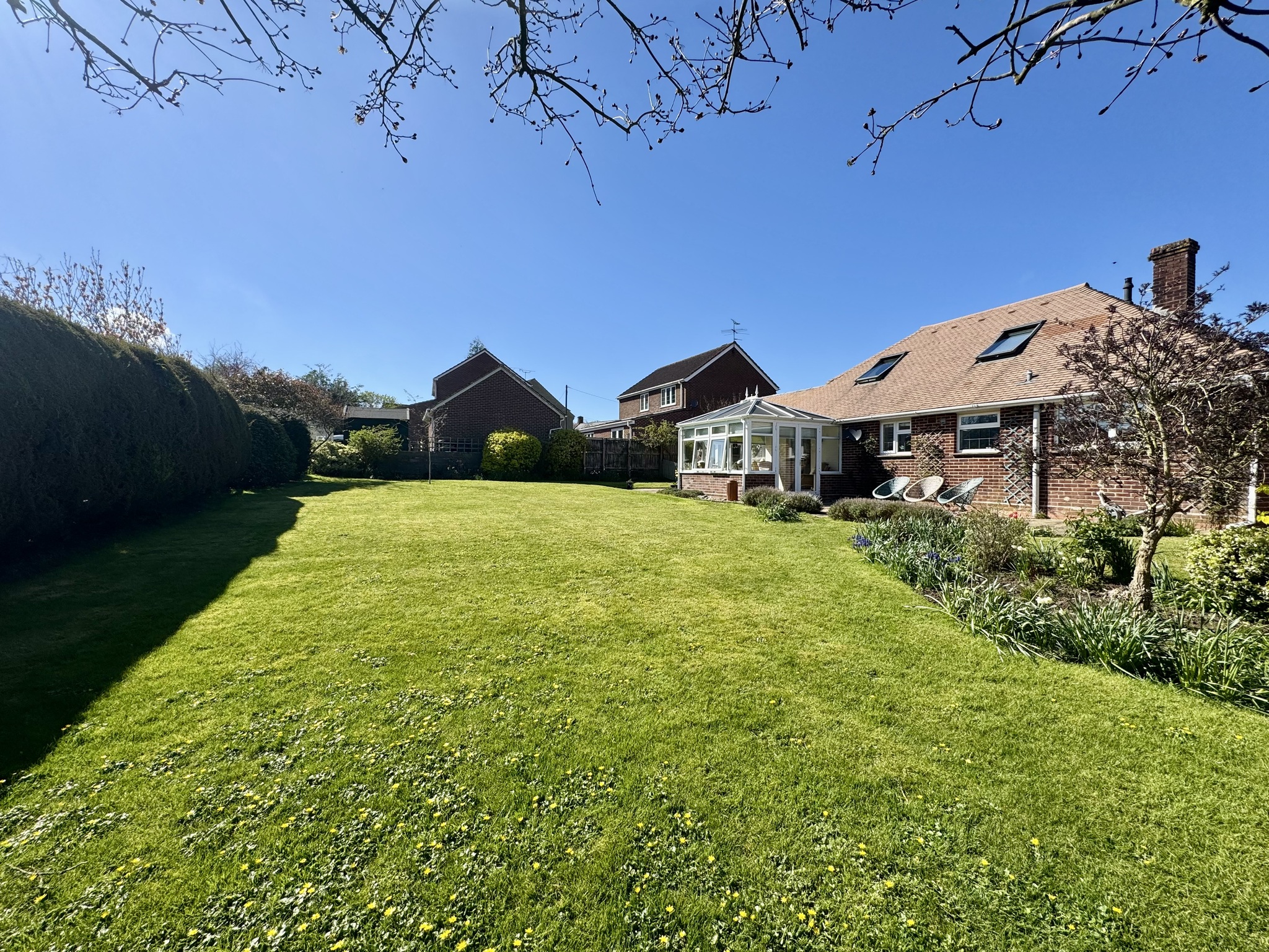 To the rear, the property truly shines. A bright conservatory overlooks the expansive garden, providing an ideal space for relaxing or entertaining year-round. The substantial rear garden is mainly laid to lawn with mature planting, offering privacy, space for children to play, and excellent potential for further landscaping or outdoor living areas.